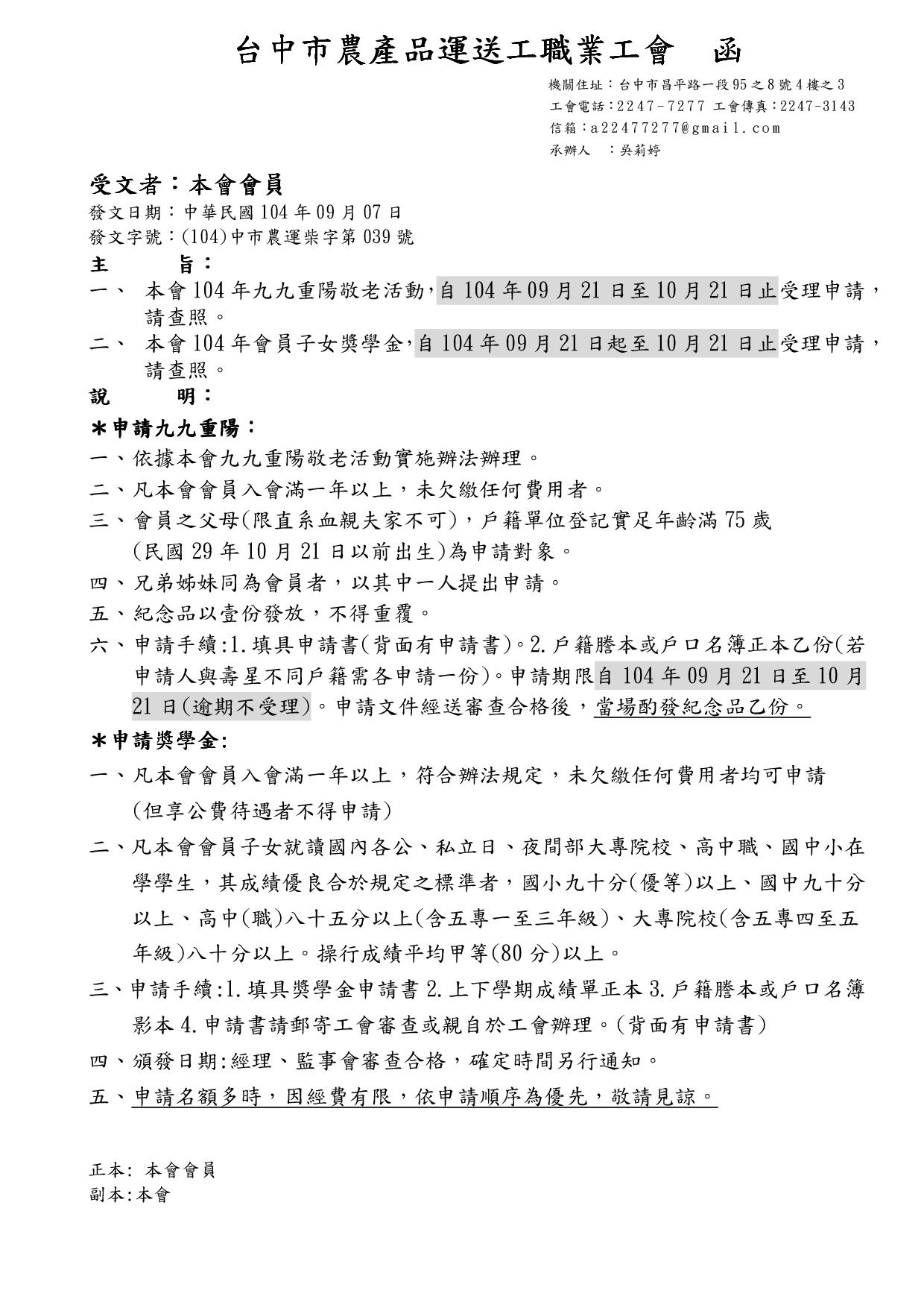| 標 題 | 開始辦理九九重陽敬老活動及申請子女獎學金囉! | |