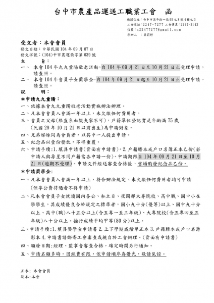 104年度九九重陽敬老活動 活動日期:自104年09月21日至10月21日止 說明: 一、依據本會九九重陽敬老活動實施辦法辦理。 二、凡本會會員入會滿一年以上,未欠繳任何費用者。 三、會員之父母(限直系血親夫家不可),戶籍單位登記實足年齡滿75歲 (民國29年10月21日以前出生)為申請對象。 四、兄弟姊妹同為會員者,以其中一人提出申請。 五、紀念品以壹份發放,不得重覆。 六、申請手續: 1.填具申請書(背面有申請書)。 2.戶籍謄本或戶口名簿正本乙份(若申請人與壽星不同戶籍需各申請一份)。 申請期限自104年09月21日至10月21日(逾期不受理)。 申請文件經送審查合格後,當場酌發紀念品乙份。