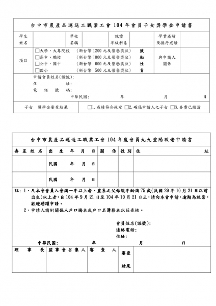 104年度申請子女獎學金 活動日期:自104年09月21日至10月21日止 說明: 一、凡本會會員入會滿一年以上,符合辦法規定,未欠繳任何費用者均可申請 (但享公費待遇者不得申請) 二、凡本會會員子女就讀國內各公、私立日、夜間部大專院校、高中職、國中小在 學學生,其成績優良合於規定之標準者,國小九十分(優等)以上、國中九十分 以上、高中(職)八十五分以上(含五專一至三年級)、大專院校(含五專四至五 年級)八十分以上。操行成績平均甲等(80分)以上。 三、申請手續: 1.填具獎學金申請書 2.上下學期成績單正本 3.戶籍謄本或戶口名簿影本 4.申請書請郵寄工會審查或親自於工會辦理。 四、頒發日期:經理、監事會審查合格,確定時間另行通知。 五、申請名額多時,因經費有限,依申請順序為優先,敬請見諒。 |