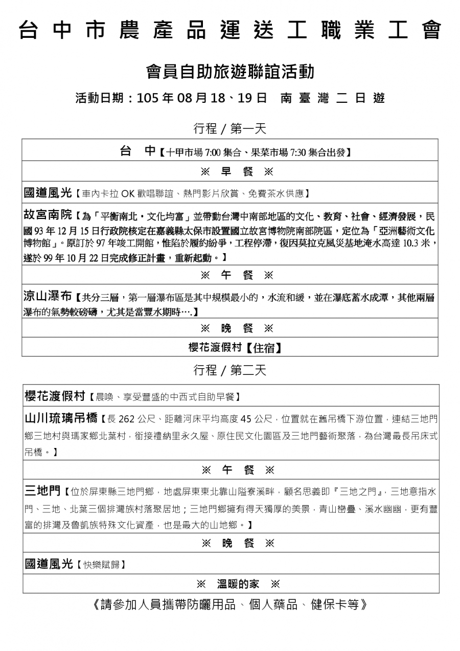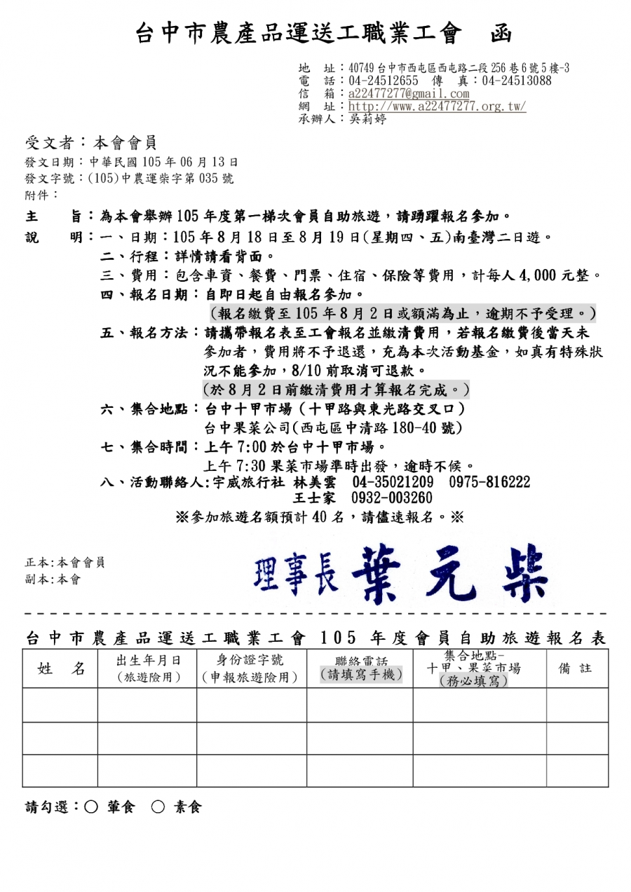 ※ 本會專為從事農產品運送工的工作人員們設置 如從事運送地、市場買賣地運送農產品 誠擎的邀請您加入台中市農產品運送工職業工會會員 ※