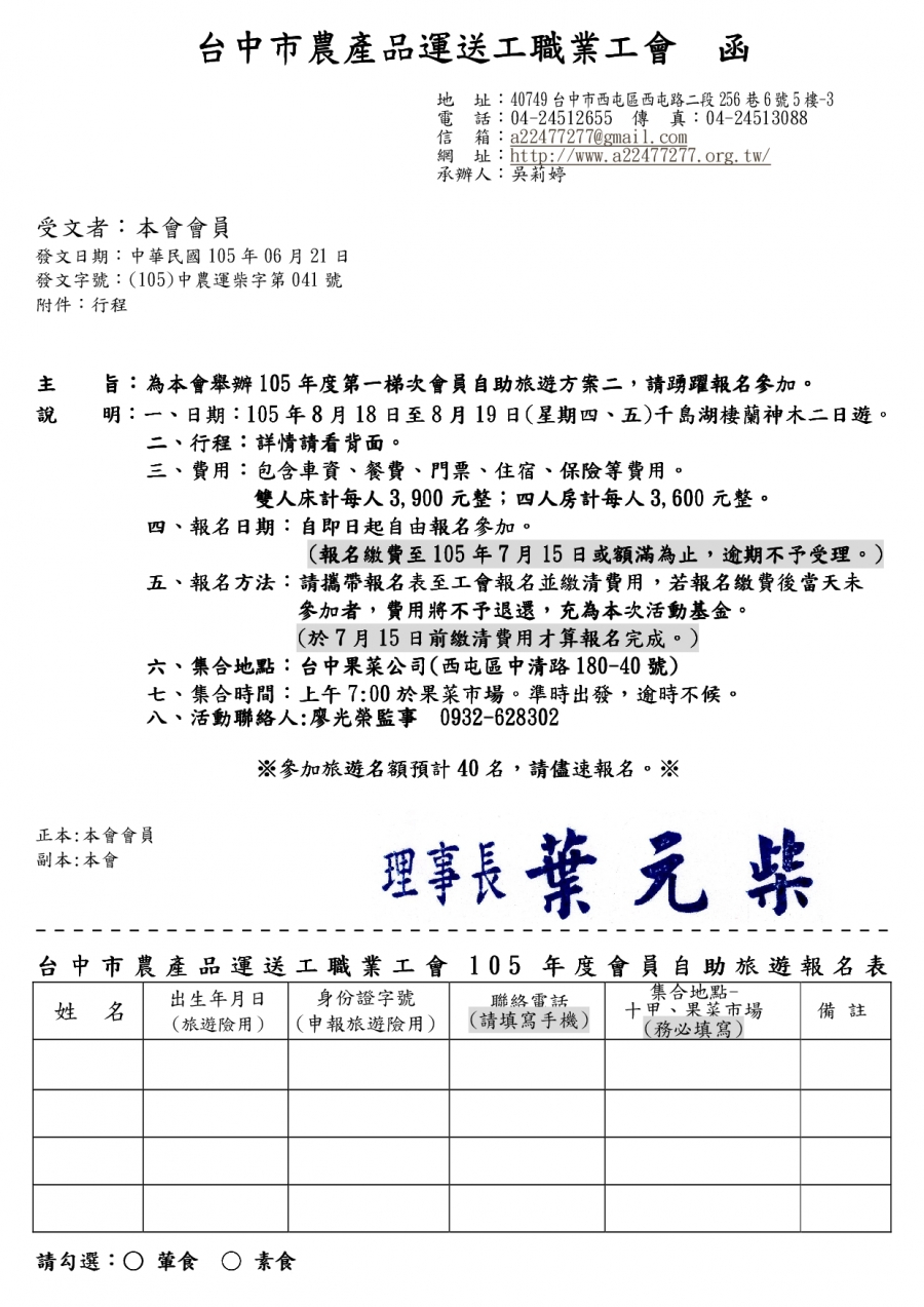 ※ 本會專為從事農產品運送工的工作人員們設置 如從事運送地、市場買賣地運送農產品 誠擎的邀請您加入台中市農產品運送工職業工會會員 ※