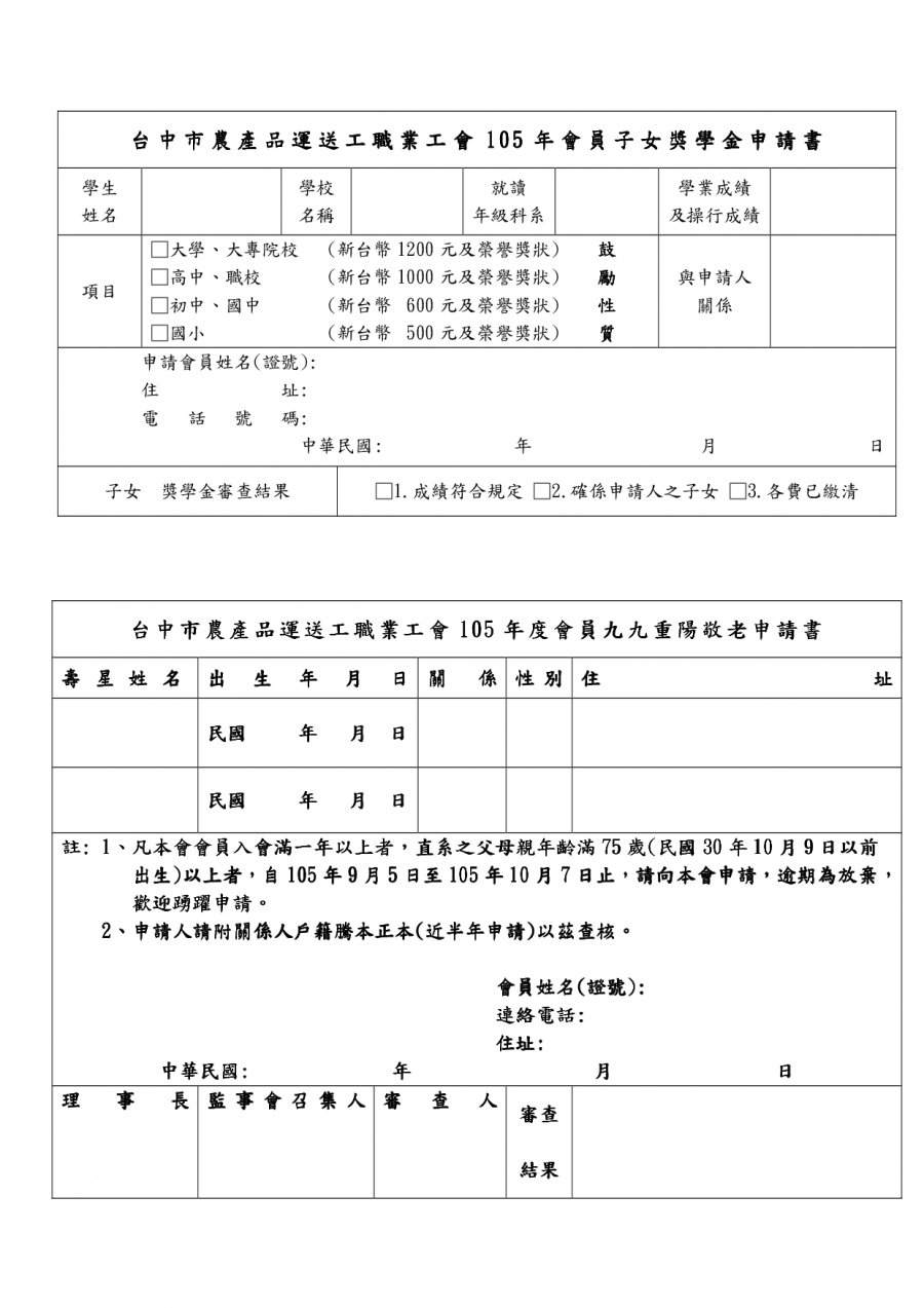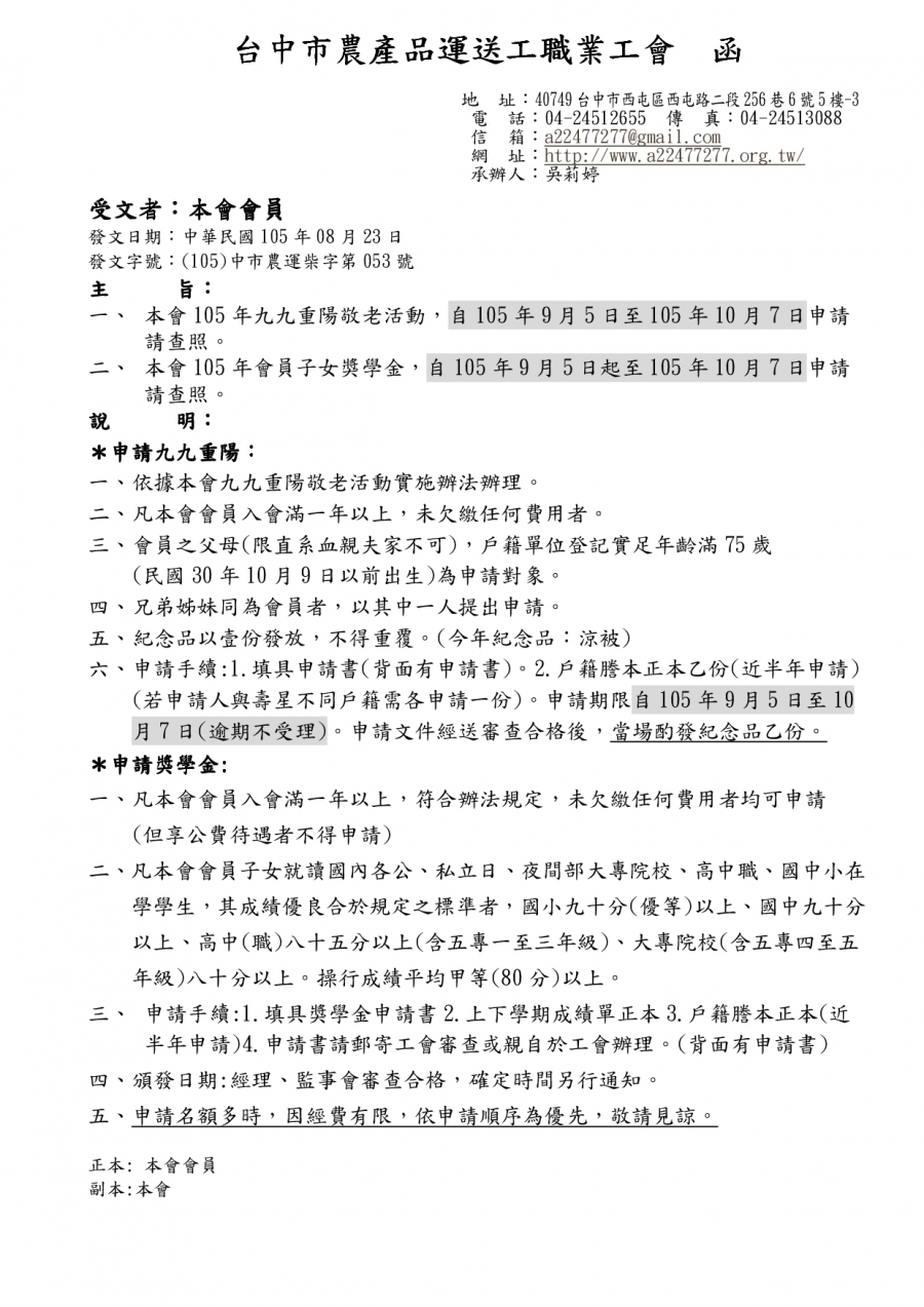 本會105年九九重陽敬老活動及會員子女獎學金,自105年9月5日至105年10月7日申請。