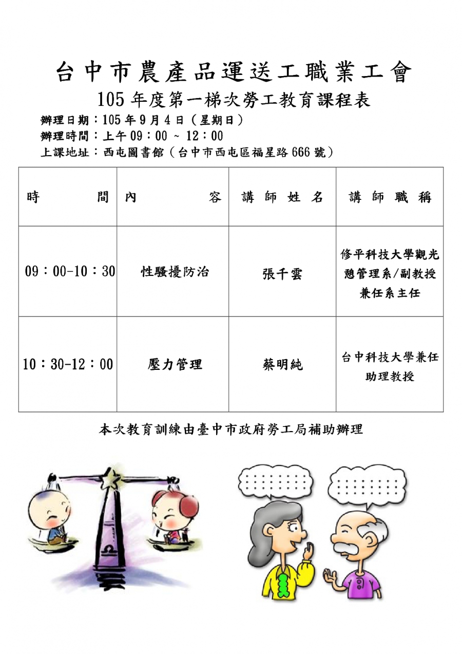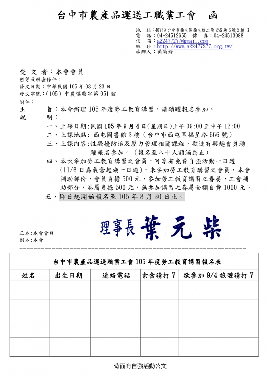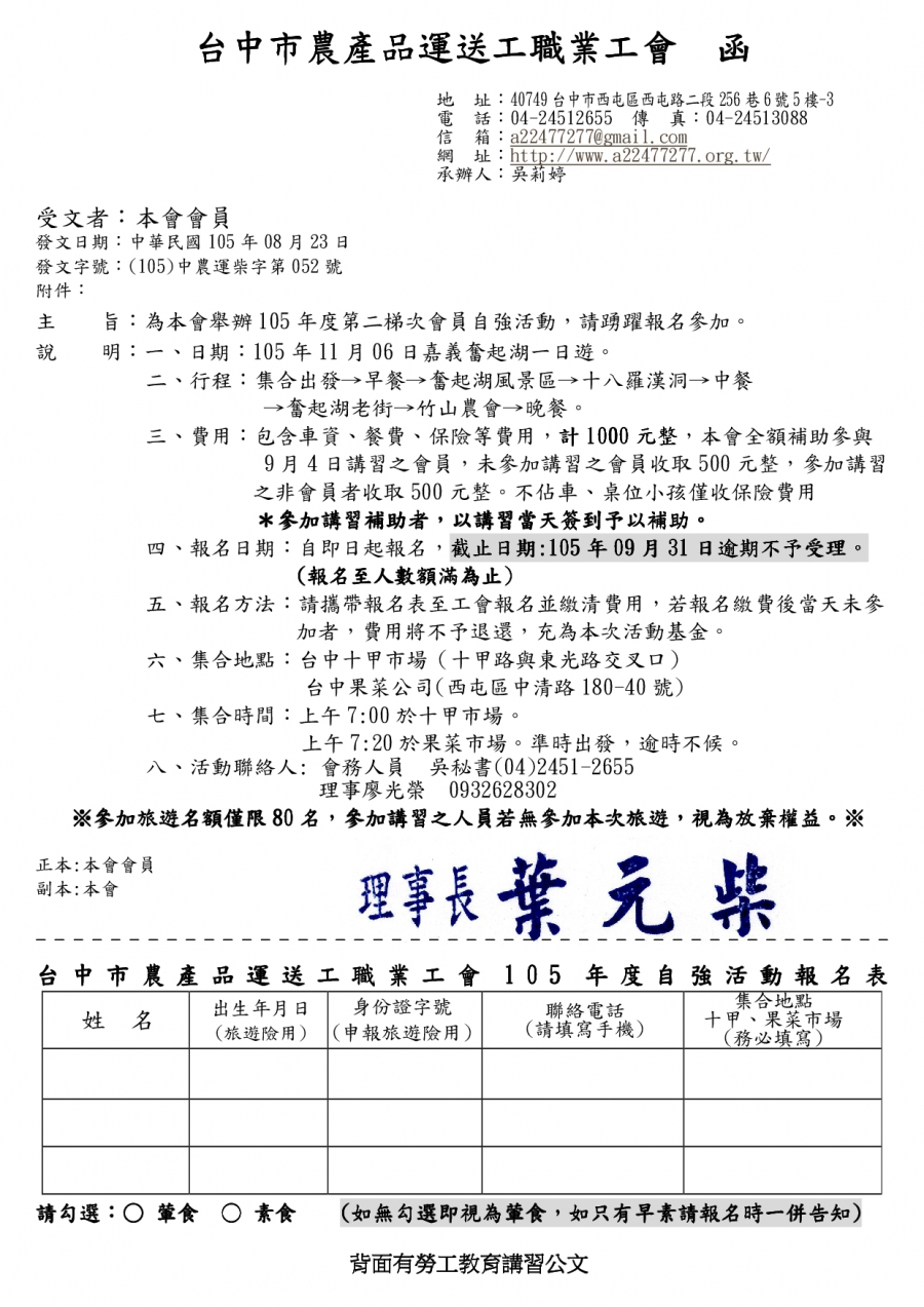 9/4(日) 早上9點到中午12點 本會辦理105年度勞工教育講習 上課內容分別是性騷擾防治和壓力管理 請有意願上課的會員們盡快報名 上完課除了吸收知識外,還有便當領唷! 有上課的會員報名11/6 奮起湖一日遊 本會招待出去玩 免費唷! 趕快打電話或傳真報名 電話:04-24512655 傳真:04-24513088