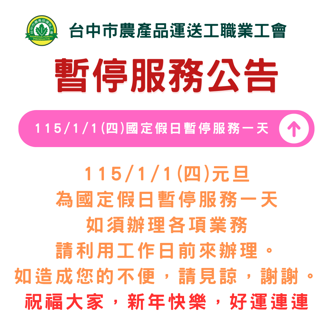 暫停服務公告 115/1/1(四)元旦 為國定假日暫停服務一天 如須辦理各項業務 請利用工作日前來辦理。 如造成您的不便,請見諒,謝謝。 祝福大家,新年快樂,好運連連⭐️